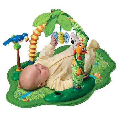 This is another great activity mat that I'd recommend. Gym features Baby Einstein characters on the mat and on the dangling part of the padded bars. The mat is brightly colored and has numerous activities to engage the child such as a ladybug rattle, squeaking duck, and a plush star with lights and music.